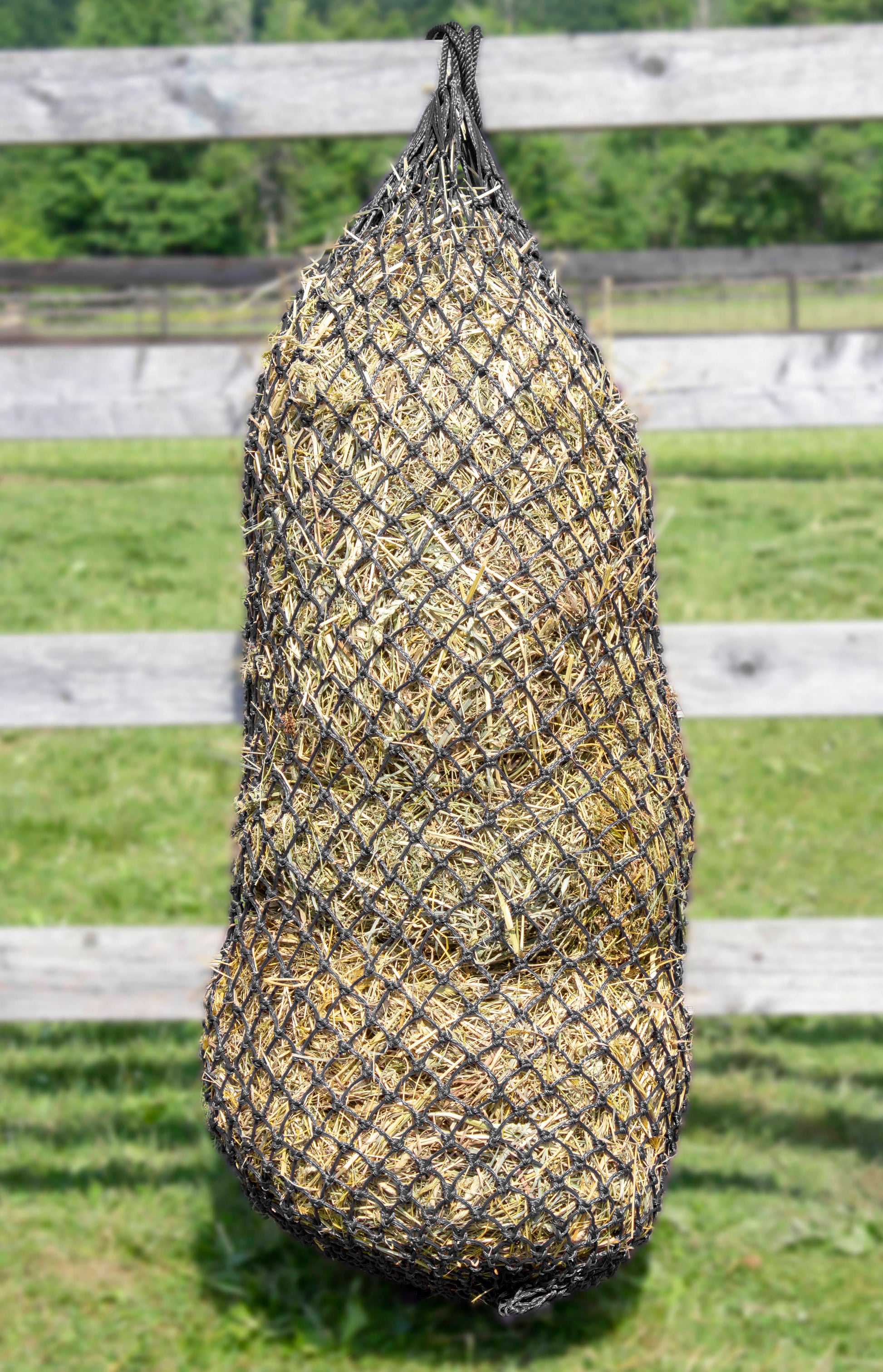 Derby Originals Ultra Slow Feed Hanging Hay Net for Horses are the perfect everyday slow feeding option for your horses. These sturdy hay nets are made from a durable poly rope that is long-lasting . Our slow feed hay nets have been carefully designed to be comfortable for your horse to use and are great for daily individual and group feeding, use while trailering, and for soaking hay. Our hay nets are available in a wide array of sizes and colors so that you can find the perfect net for you and your horse! Please be aware that all Derby Originals slow feed hay nets are made by hand, and may have slight variation in overall size and the size of the openings. All measurements and capacities listed are approximate. The amount of hay that our hay nets can hold varies greatly due to the type of hay being fed, the dimensions of the hay bale, and the size of the hay flake.