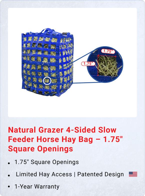 Natural Grazer 4-Sided Slow Feeder Horse Hay Bag – 1.75" Square Openings – Limited Hay Access | Patented Design – 1-Year Warranty