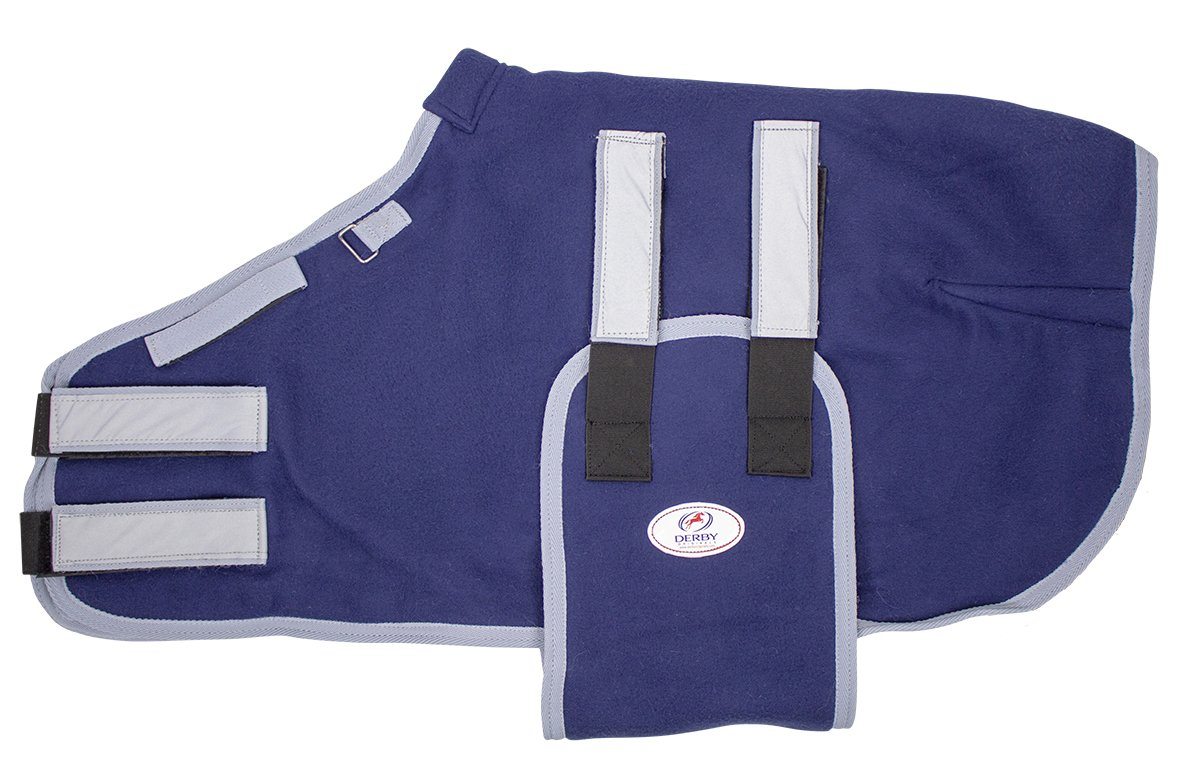 Derby Originals Reflective Safety Fleece Sheet for Foals was designed to offer a better and more modern solution to outdated foal blanket designs. Our fleece sheet features a pair of adjustable double-velcro chest straps that allow for the blanket to be adjusted to fit smaller or larger foals. These chest straps are elastic to allow for a more comfortable and snug fit, which helps keep your foal safe and from becoming tangled. This sheet also features matching elastic double-velcro belly straps for the best possible fit. All four chest and belly straps are covered in reflective tape to greatly increase visibility and help keep your foal safe outside or in the pasture. We're proud to be the original inventor of the hardware free foal blanket, which has no metal parts to increase your foal's comfort and safety. Our innovative sheet also has a pair of adjust-to-fit neck-straps to allow for a better fit around the neck opening. Our sheets are made from warm and soft polar fleece, which is comfortable to wear and helps to regulate your foal’s temperature to prevent chilling or overheating all year round. Our fleece sheets are also designed to be moisture-wicking and are great for keeping sweat and water off your foal. They’re great for drying your foal off after a bath! Our sheets are multipurpose and can function as an all-season blanket, blanket liner, or cooler. These sheets are available in three attractive colors so you can find the perfect blanket to suit your new foal: Royal Blue, Red, and Navy Blue.